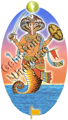 Ketu is unbiased, hybrid, inactive, disfigured and troublemaking. He creates disturbances in the physical bodies of its natives, causing them to lose interest in life. Ketu is shown with a headless torso with a fish body, called the dragon's tail. He holds a flag of self glory in his hand. Ketu is less destructive than Rahu and leads its natives toward salvation from the bondage of life and death making them passive.