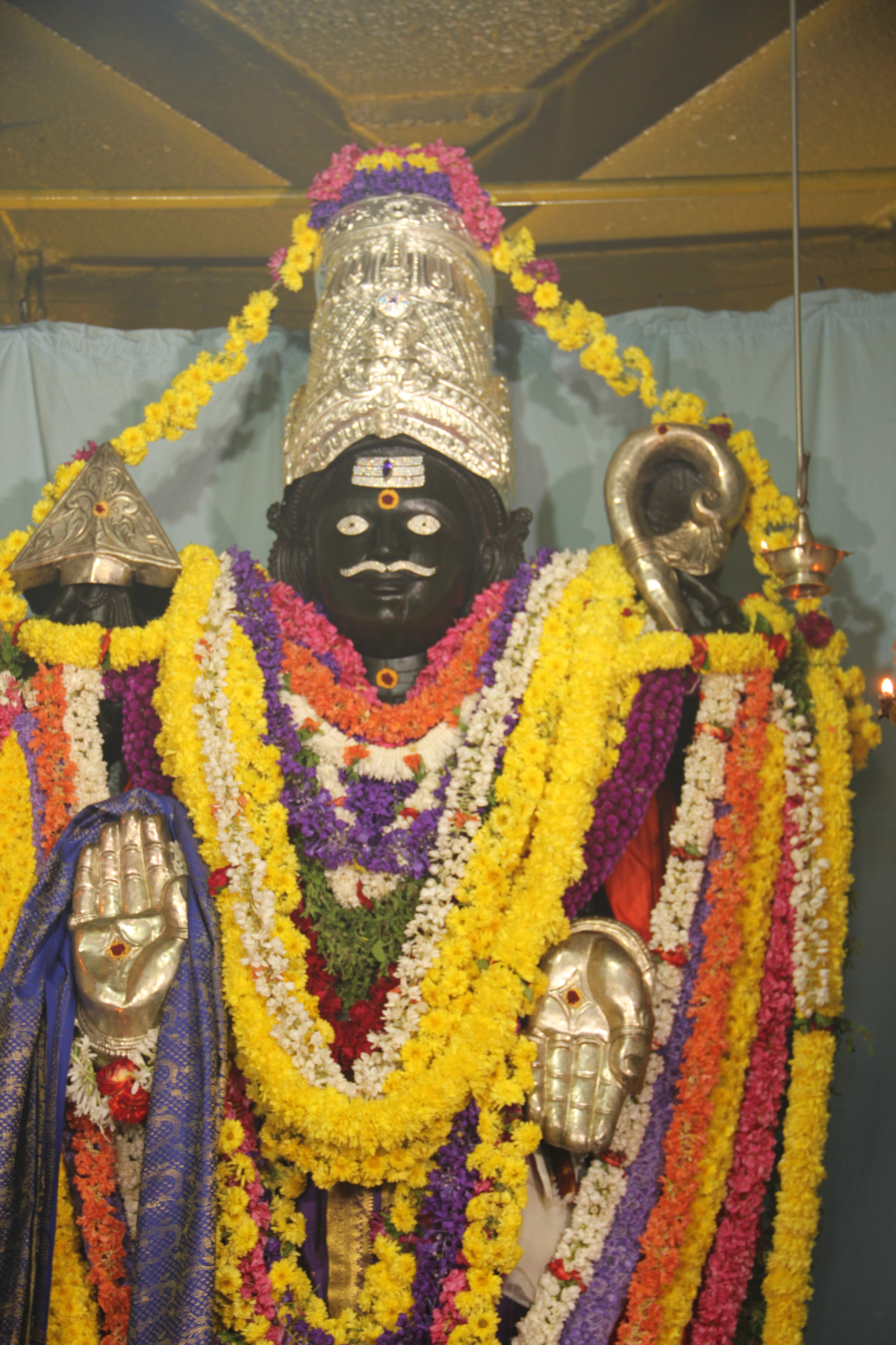 The new crown encrusted with an exceptional Ceylonese Blue sapphire was mounted on the 12 feet high deity on the day of Shaneeshwari amavasya.